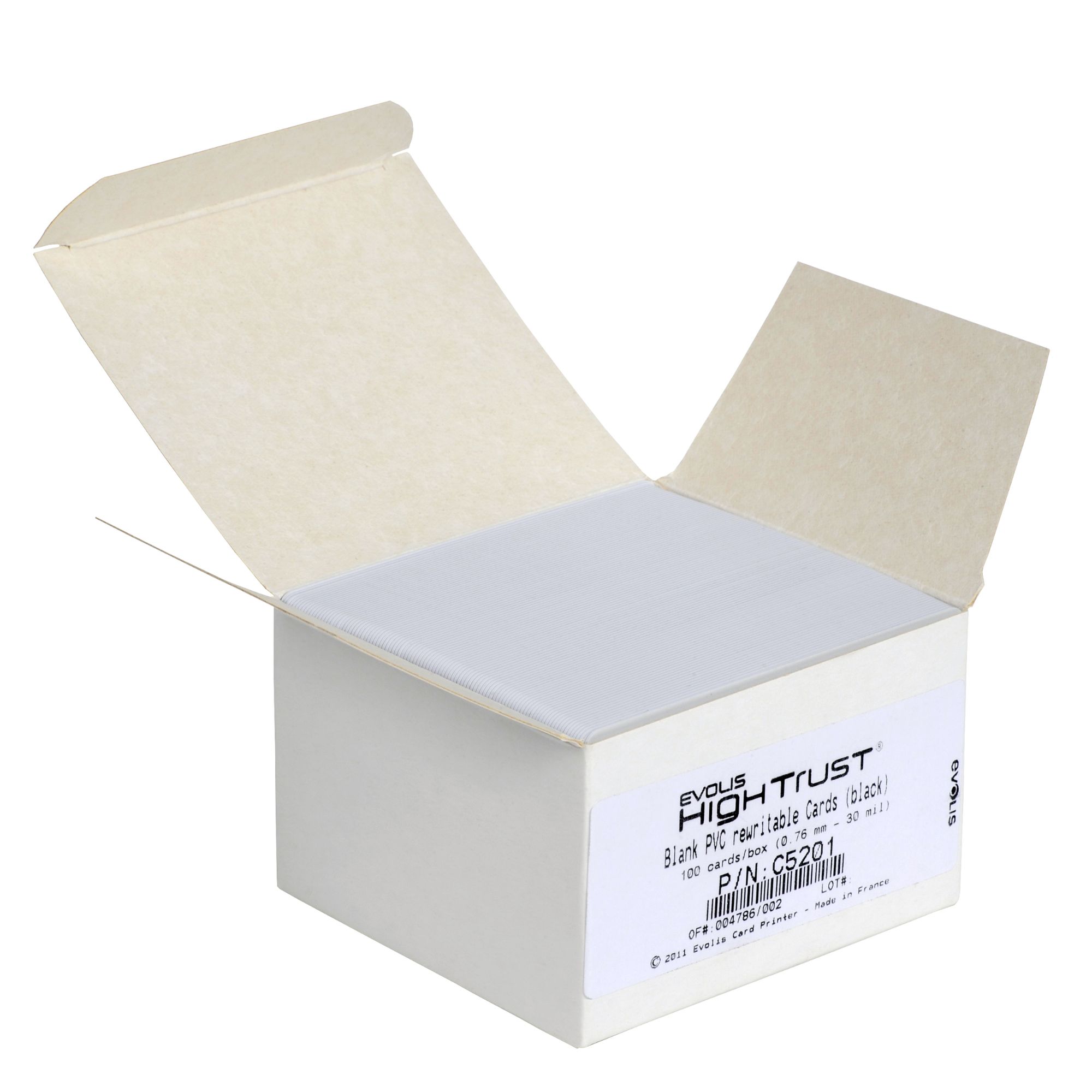 Carduri rescriptibile Evolis C5201, 100 buc, negre, 30 mil, PVC alb, compatibile cu Tattoo2 RW pentru badge-uri și carduri reutilizabile.