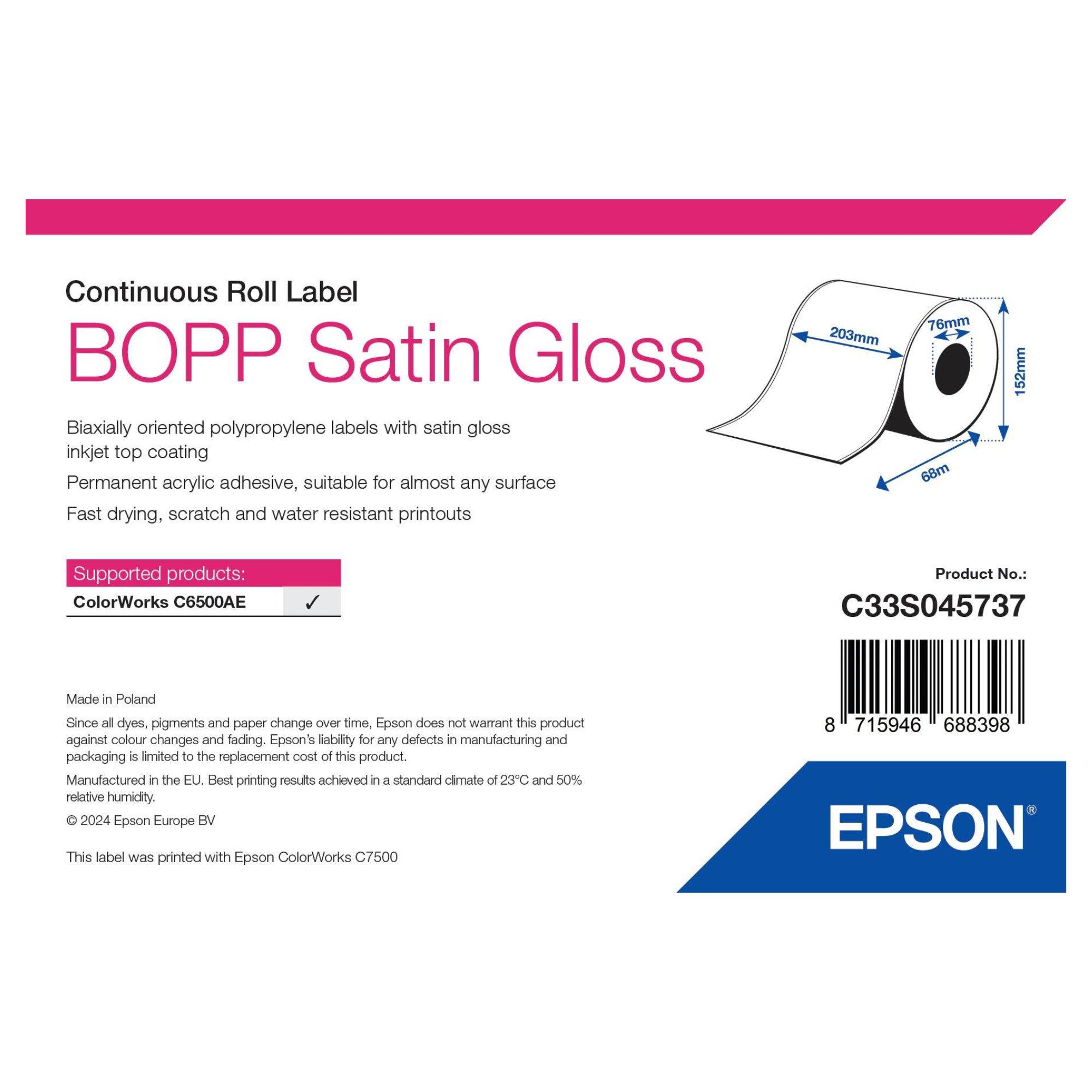 Rolă etichete sintetice Epson BOPP Satin Gloss 203 mm x 68 m, continuă, miez 76 mm, diametru 152 mm. Rezistente la apă și substanțe chimice, compatibile cu ColorWorks C6000. MOQ 4 buc.