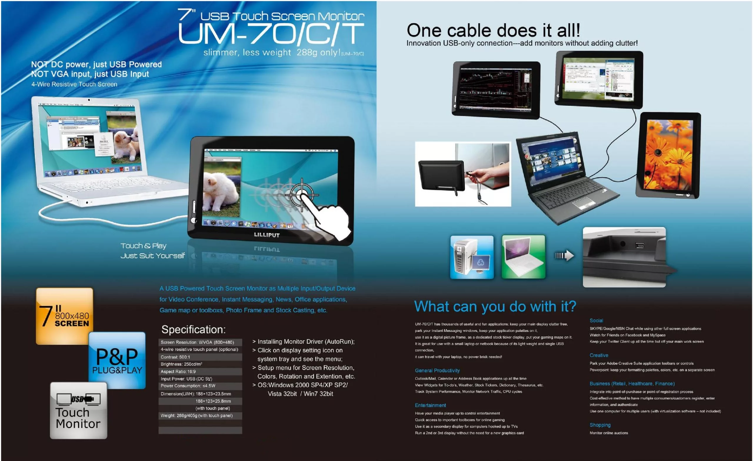 Lilliput UM70/C este un monitor LCD cu ecran lat de 7 inchi, utilizând o tehnologie inovatoare de afișare USB. Prin conectarea cablului USB la două porturi USB ale unui computer gazdă și instalarea driverelor necesare, monitorul funcționează fără a necesita o sursă de alimentare externă.