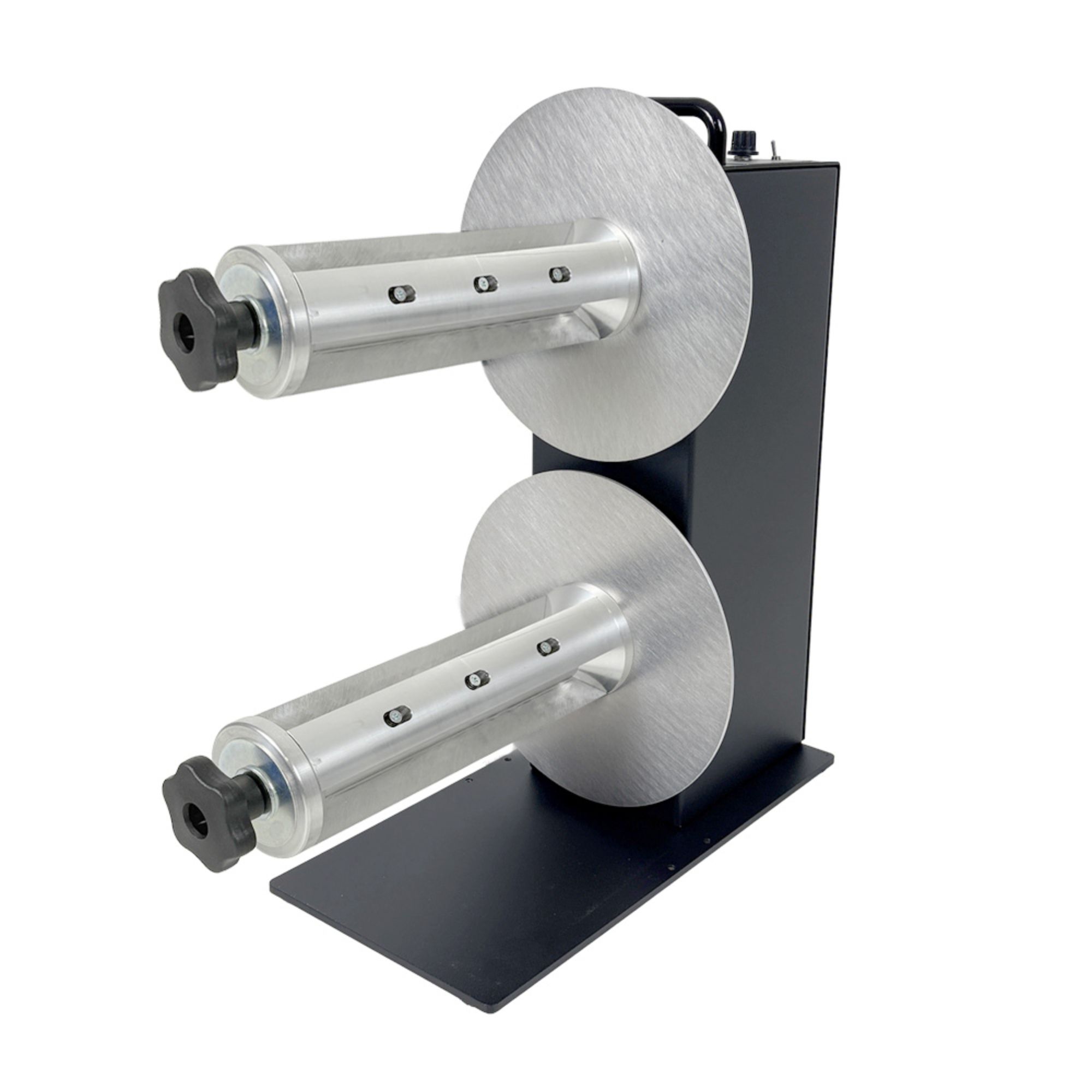 Stație dual spindle Labelmate TWIN-CAT-2 cu 2 Quick-Chuck C-76270 (LMR016/LMX466) pentru miez 76 mm și lățime până la 270 mm. Control independent torque/viteză + direcție, 2ר220 mm, 2×5 kg, viteză până la 125 cm/s.